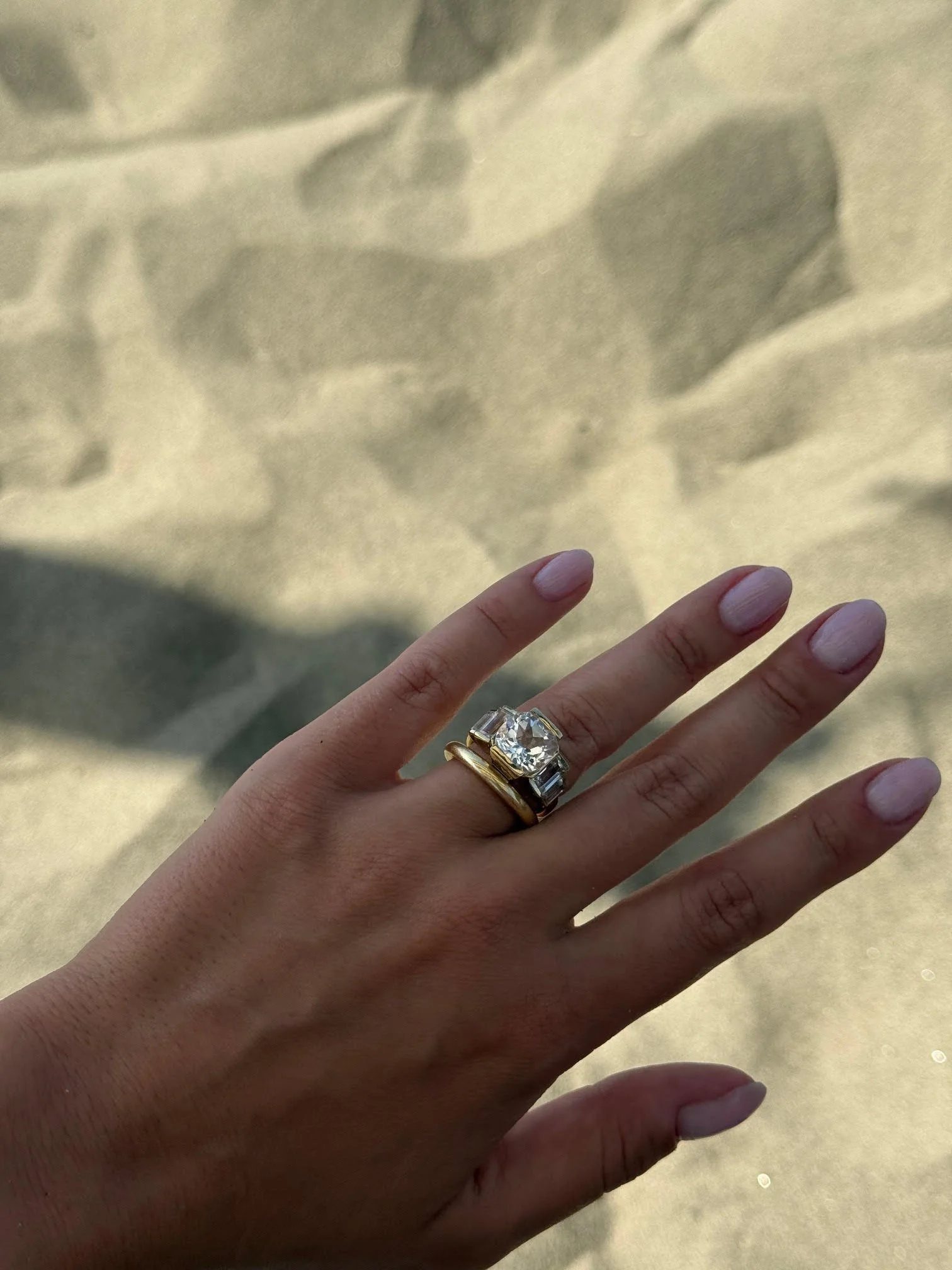 14K yellow gold with 4ct center stone, 2 x 2ct stones and 2 x 0.40ct stones, all in natural white topaz.