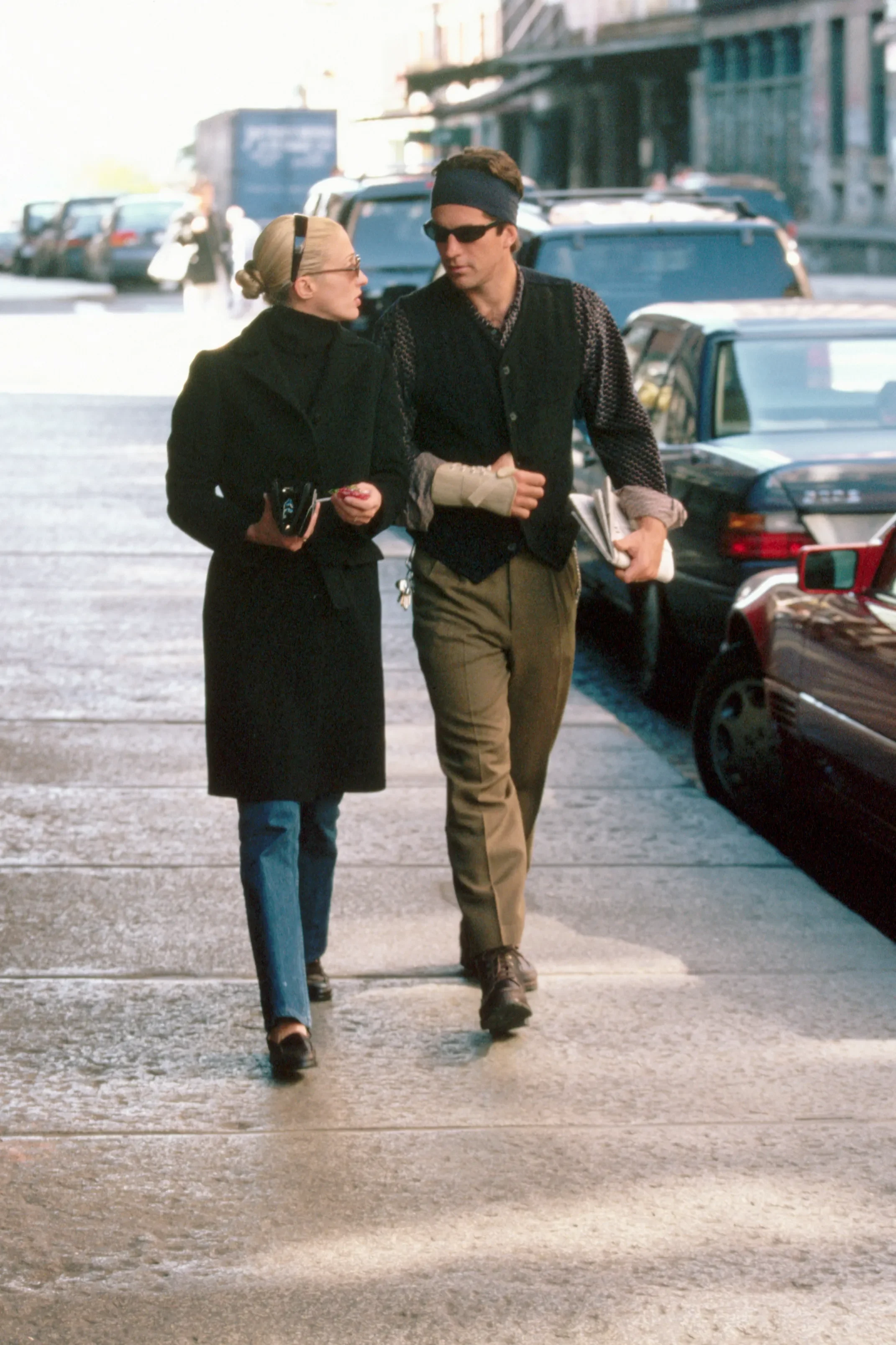 This is Carolyn Bessette at her most effortless — the kind of off‑duty, running‑errands street style that somehow still feels impossibly refined. A pair of simple jeans, classic loafers, a black polo layered under a long black coat, and her signature slicked‑back hair held with a narrow headband. A structured clutch in one hand and slim, minimalist sunglasses complete the look. Nothing loud, nothing forced — just style.